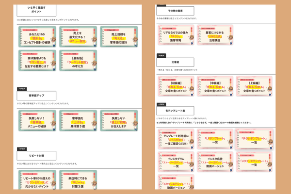 メンバー専用の会員サイトをご用意。「集客・リピート・単価アップ・開業・AI活用」など、現在のサロン経営に必要な知識を体系的に学べます。