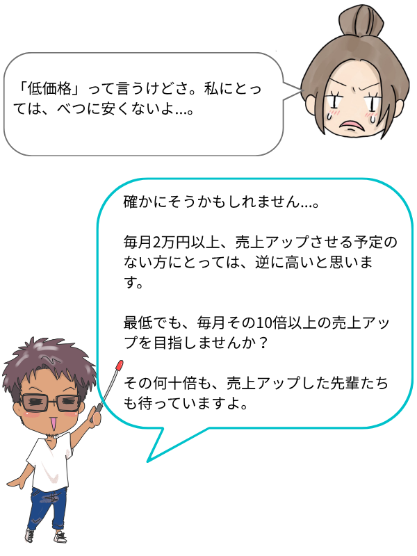 正直、お子様の学習塾より、お安いかと思います。月に2名、お客様が増えれば元がとれる価格です。